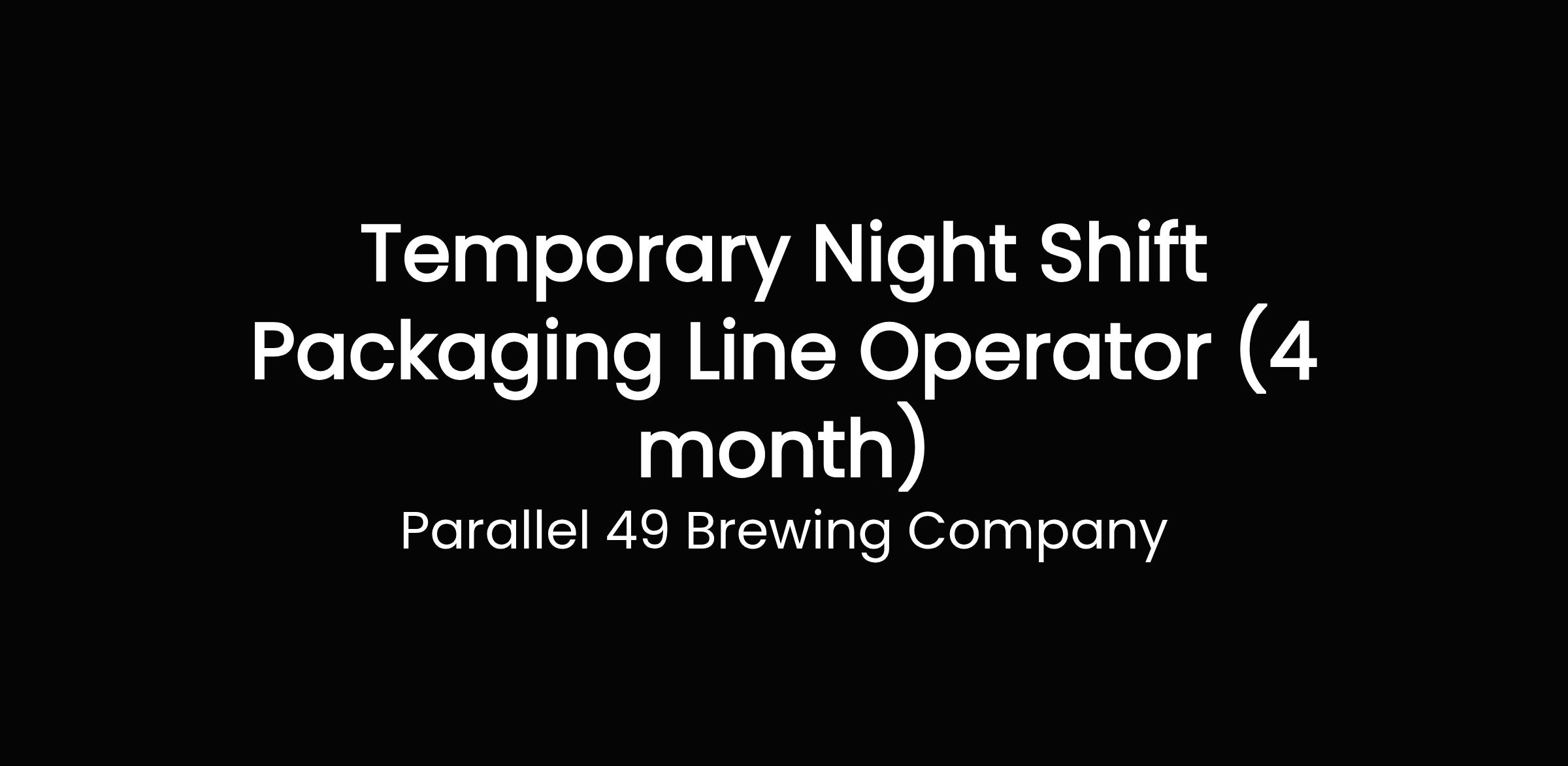 The Temporary Night Shift Packaging Line Operator is responsible for running packaging equipment at Parallel 49 Brewing’s production brewery in Vancouver, BC. Responsibilities include ensuring a safe work environment, monitoring packaged products to ensure a high level of quality, cleaning and sanitization of the plant and equipment, upholding Parallel 49’s quality standards, and proper use of mechanical equipment.